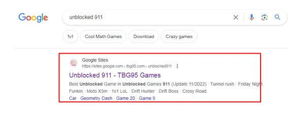 Google is going to provide you with several relevant search results on its first page. Here, you need to click on the first link (https://sites.google.com/tbg95.com/unblocked911) (we have shown it in the image below):